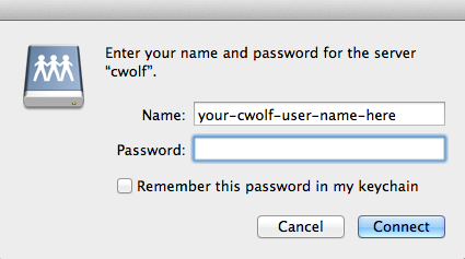 Click on Connect to get a prompt from blue to log in. Enter your blue login-name and password and then click on Connect.