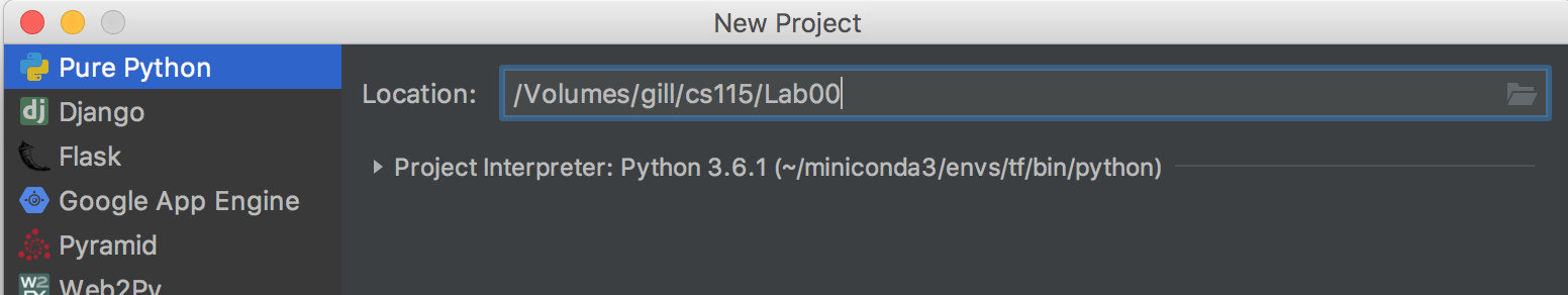 Click on Create New Project. Notice that the default is to create the project on the local machine. We do not want that. So, click on the folder icon on the right side Location to select a directory through the Finder.
