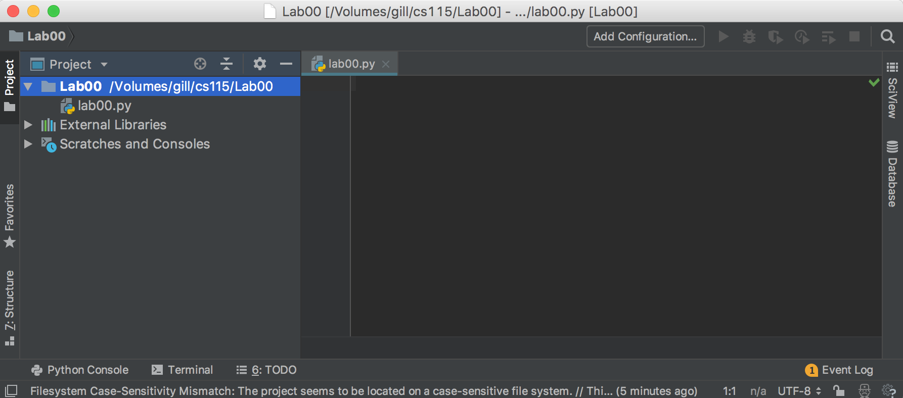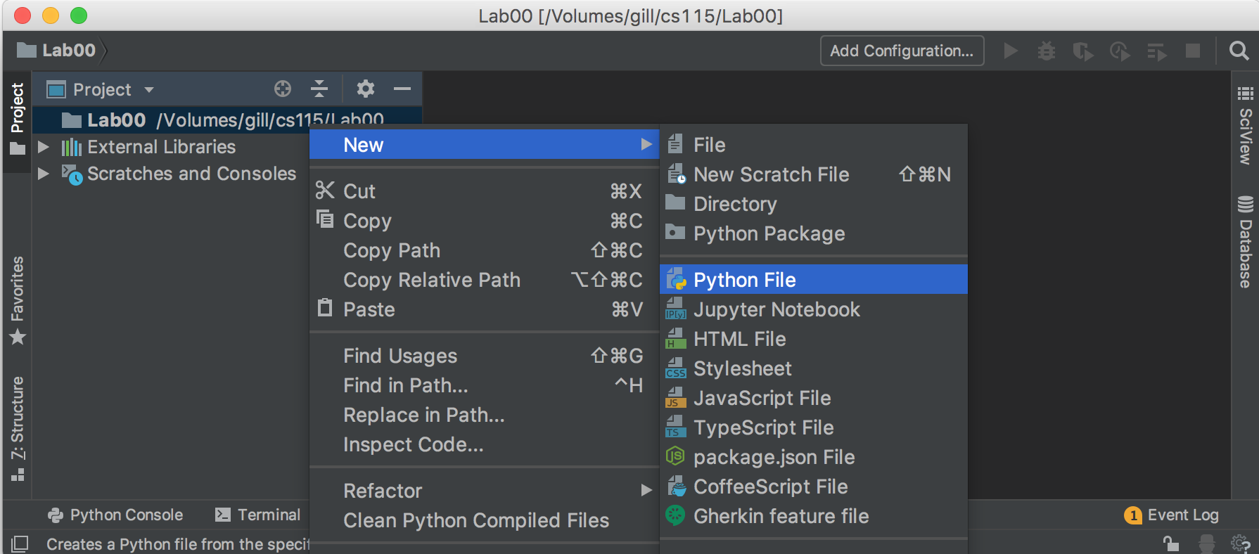 Let's create a new file. Right click on Lab00 and select New->Python File. In the window that opens up enter the name of the file as lab00.py and press OK.